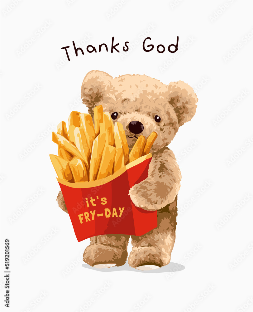 thanks god slogan with bear doll carrying French fries box vector …